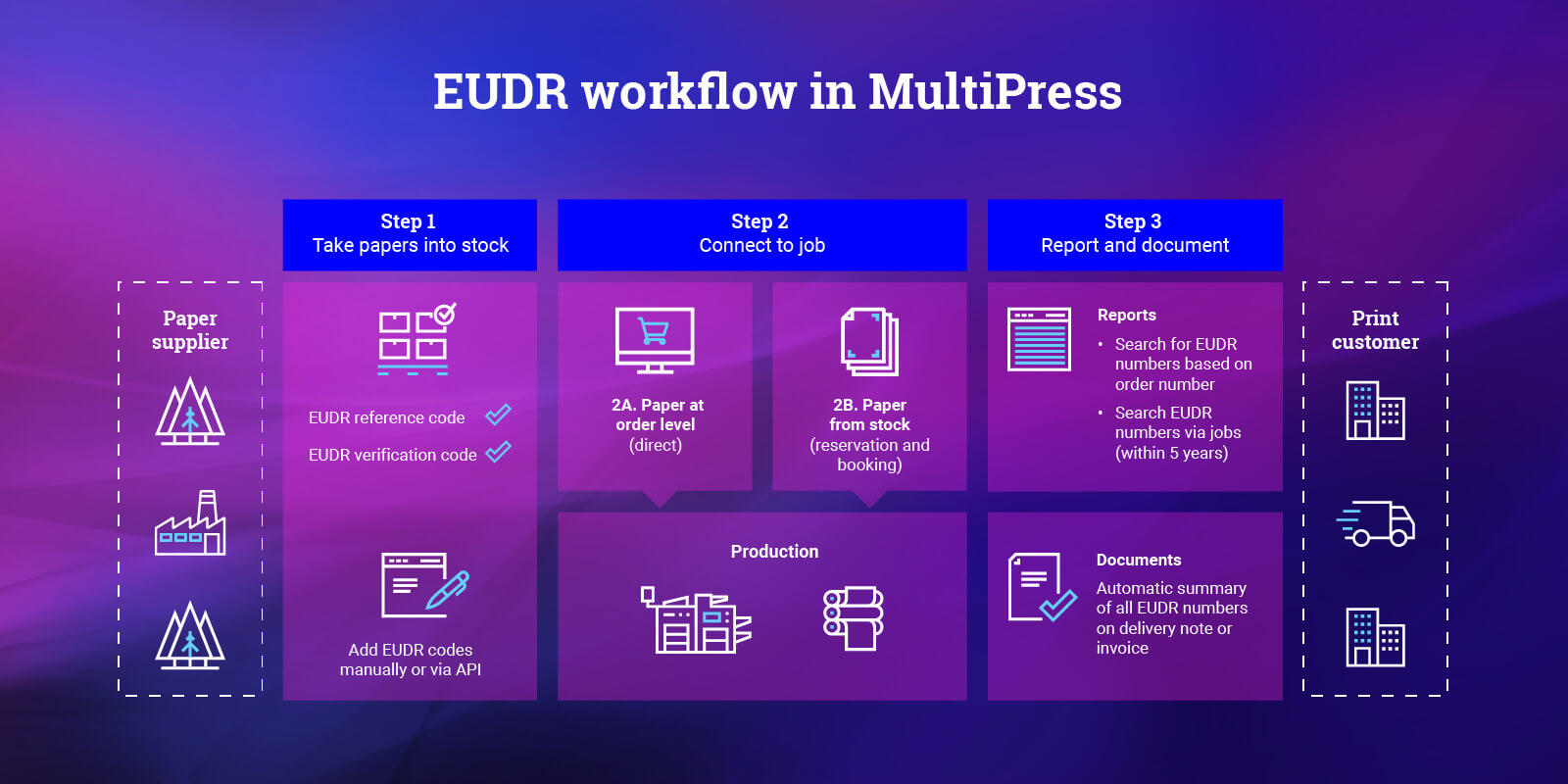 Through the combination of automation, data linkage and reporting, MultiPress transforms EUDR compliance from an obligation into a strategic asset. The software not only strengthens the sustainability position of graphic companies but also increases efficiency, reliability and competitive strength within the chain.